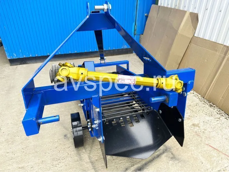 Это инструмент для выкапывания картофеля с ножом, лентой и колесами. Нож вырезает землю с клубнями и отправляет их на транспортерный механизм. Тот в свою очередь поднимает и раскладывает картофель на поверхности для сбора. Длина транспортера 950 мм. Устройство соединяется с трактором, минимальная мощность которого 18 л.с. со сцепкой и ВОМ.